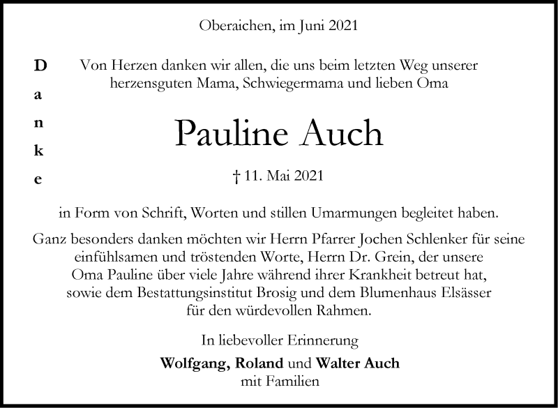 Hier finden Sie alle Traueranzeigen aus der Zeitung, die bisher für Pauline Auch erschienen sind. Weitere Traueranzeigen, die in der Zeitung erscheinen, werden hier ebenfalls aufgelistet
