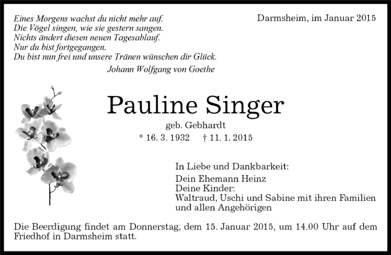 Hier finden Sie alle Traueranzeigen aus der Zeitung, die bisher für Pauline Singer erschienen sind. Weitere Traueranzeigen, die in der Zeitung erscheinen, werden hier ebenfalls aufgelistet