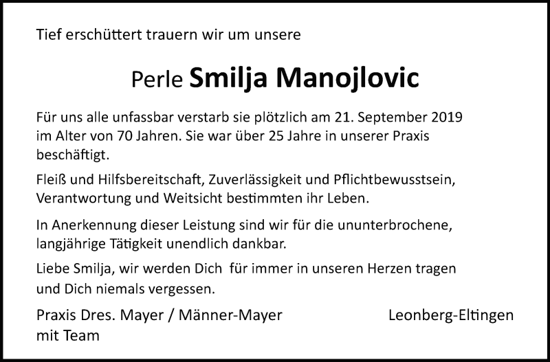 Hier finden Sie alle Traueranzeigen aus der Zeitung, die bisher für Perle Smilja Manojlovic erschienen sind. Weitere Traueranzeigen, die in der Zeitung erscheinen, werden hier ebenfalls aufgelistet