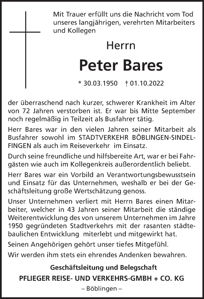 Hier finden Sie alle Traueranzeigen aus der Zeitung, die bisher für Peter Bares erschienen sind. Weitere Traueranzeigen, die in der Zeitung erscheinen, werden hier ebenfalls aufgelistet