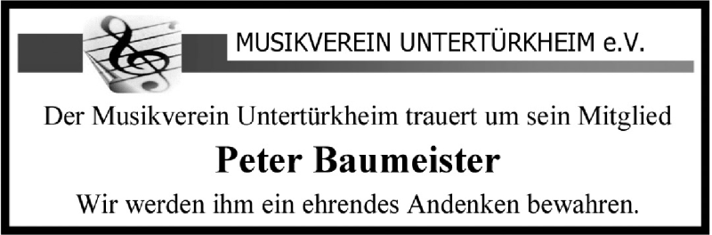 Hier finden Sie alle Traueranzeigen aus der Zeitung, die bisher für Peter Baumeister erschienen sind. Weitere Traueranzeigen, die in der Zeitung erscheinen, werden hier ebenfalls aufgelistet