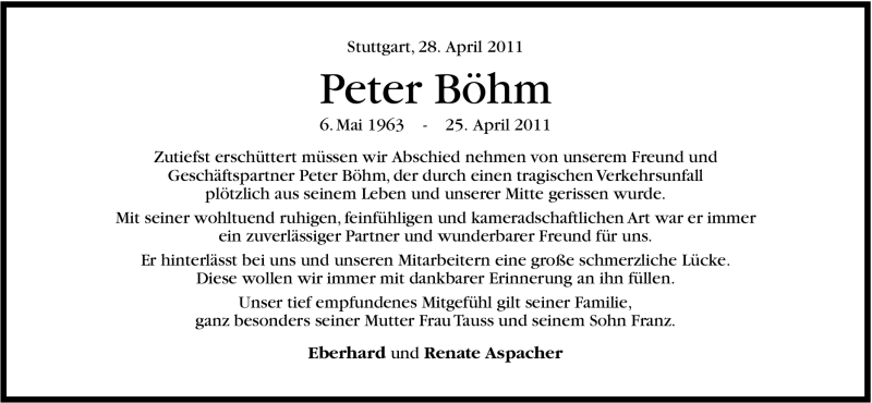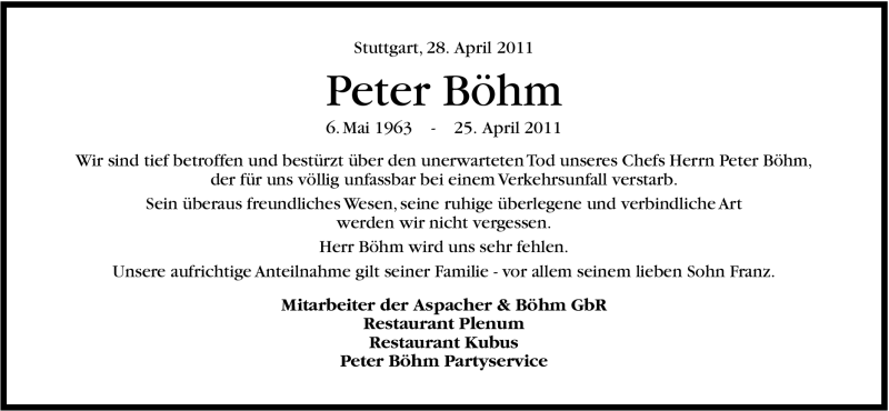 Hier finden Sie alle Traueranzeigen aus der Zeitung, die bisher für Peter Böhm erschienen sind. Weitere Traueranzeigen, die in der Zeitung erscheinen, werden hier ebenfalls aufgelistet