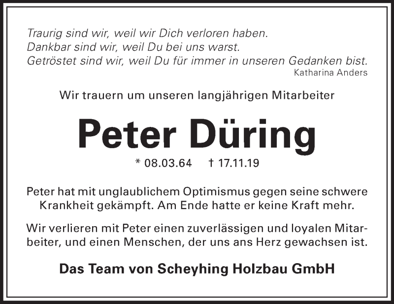 Hier finden Sie alle Traueranzeigen aus der Zeitung, die bisher für Peter Düring erschienen sind. Weitere Traueranzeigen, die in der Zeitung erscheinen, werden hier ebenfalls aufgelistet