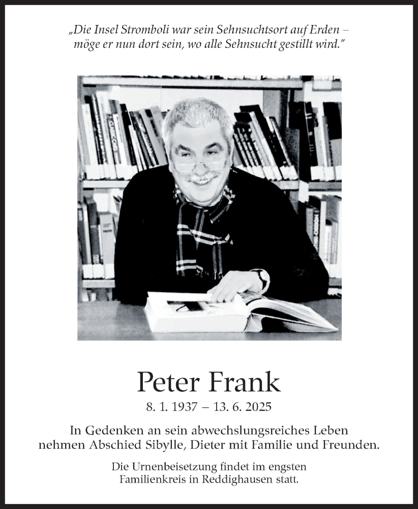 Hier finden Sie alle Traueranzeigen aus der Zeitung, die bisher für Peter Frank erschienen sind. Weitere Traueranzeigen, die in der Zeitung erscheinen, werden hier ebenfalls aufgelistet