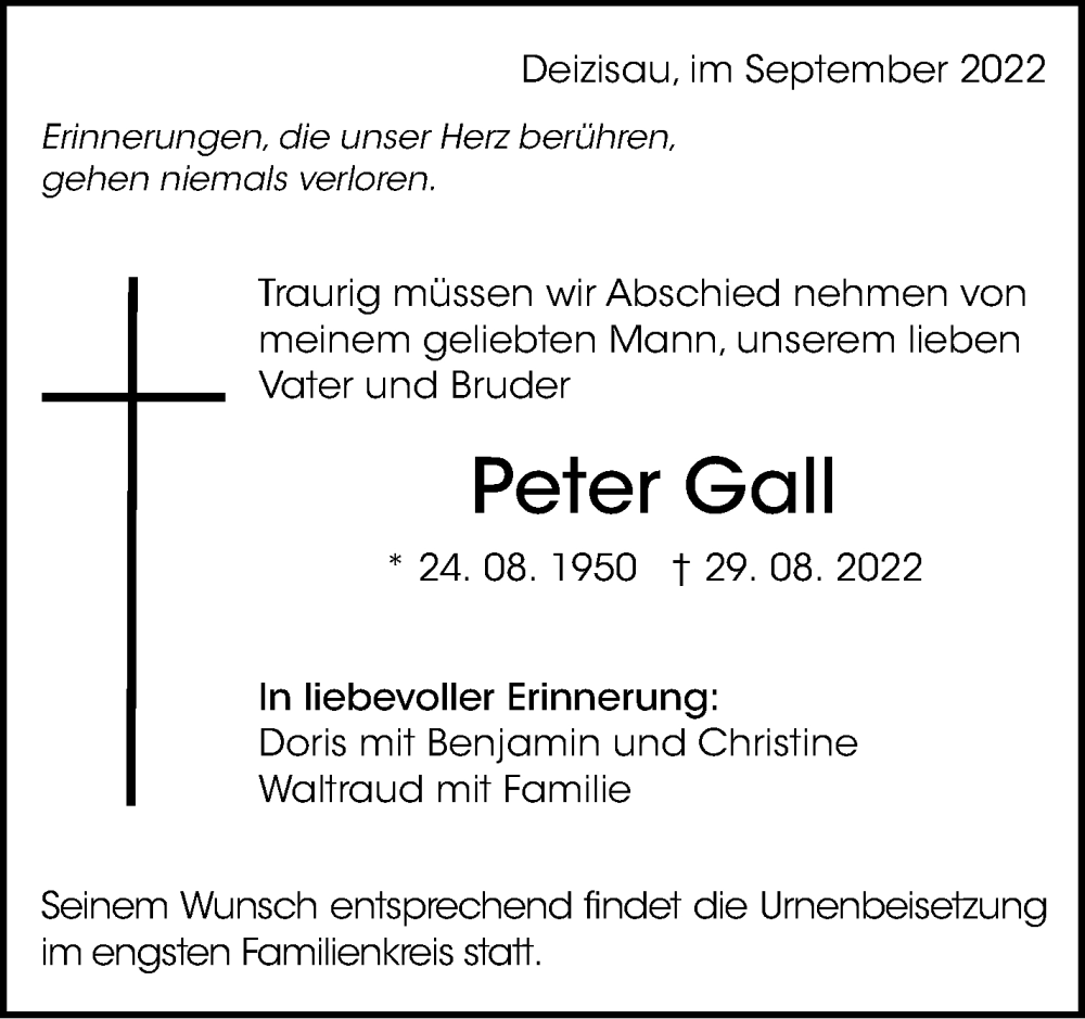 Hier finden Sie alle Traueranzeigen aus der Zeitung, die bisher für Peter Gall erschienen sind. Weitere Traueranzeigen, die in der Zeitung erscheinen, werden hier ebenfalls aufgelistet
