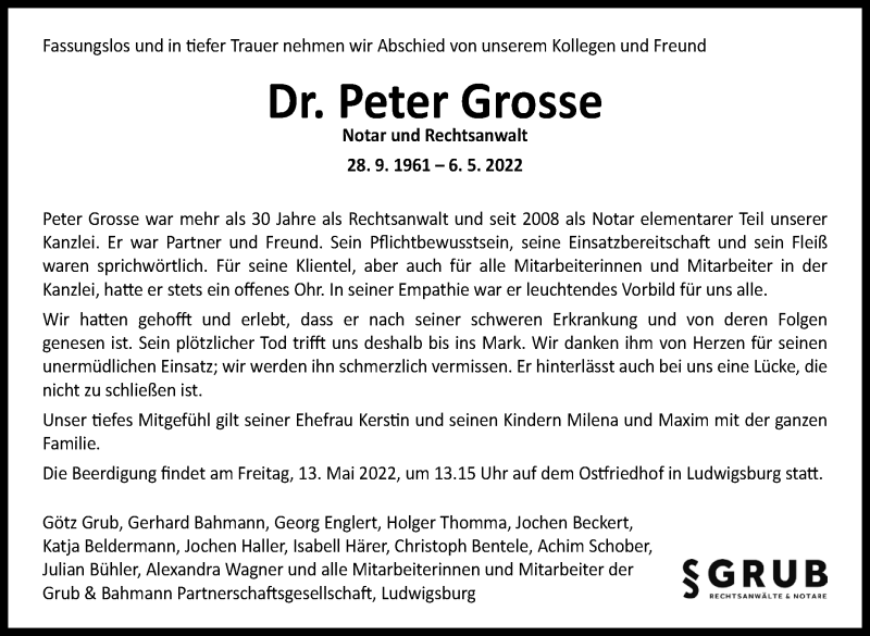Hier finden Sie alle Traueranzeigen aus der Zeitung, die bisher für Peter Grosse erschienen sind. Weitere Traueranzeigen, die in der Zeitung erscheinen, werden hier ebenfalls aufgelistet