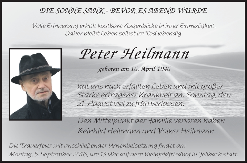 Hier finden Sie alle Traueranzeigen aus der Zeitung, die bisher für Peter Heilmann erschienen sind. Weitere Traueranzeigen, die in der Zeitung erscheinen, werden hier ebenfalls aufgelistet