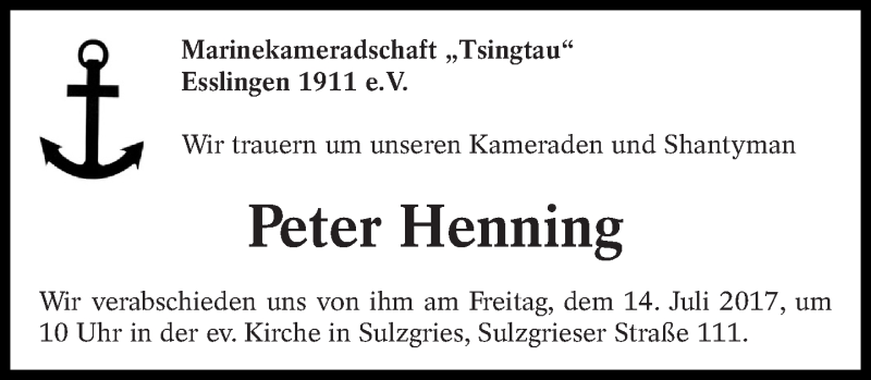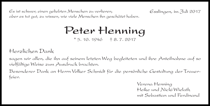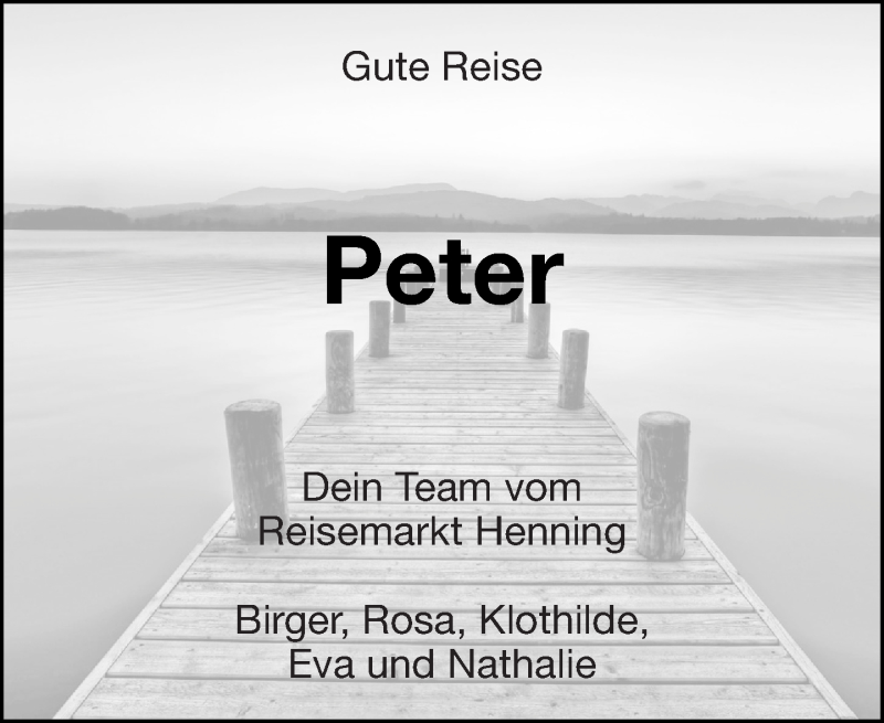Hier finden Sie alle Traueranzeigen aus der Zeitung, die bisher für Peter Henning erschienen sind. Weitere Traueranzeigen, die in der Zeitung erscheinen, werden hier ebenfalls aufgelistet