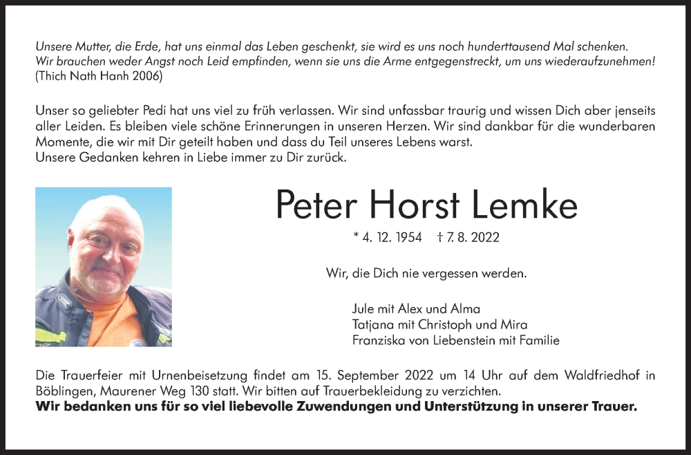 Hier finden Sie alle Traueranzeigen aus der Zeitung, die bisher für Peter Horst Lemke erschienen sind. Weitere Traueranzeigen, die in der Zeitung erscheinen, werden hier ebenfalls aufgelistet