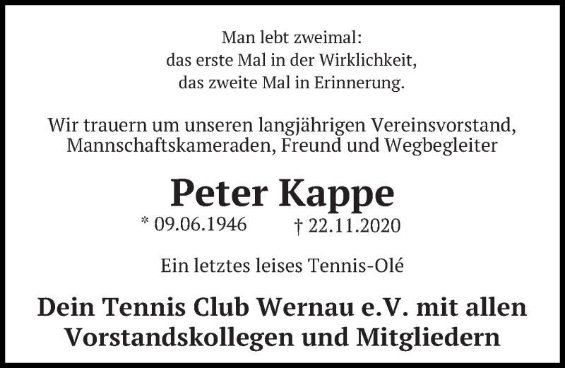 Hier finden Sie alle Traueranzeigen aus der Zeitung, die bisher für Peter Kappe erschienen sind. Weitere Traueranzeigen, die in der Zeitung erscheinen, werden hier ebenfalls aufgelistet