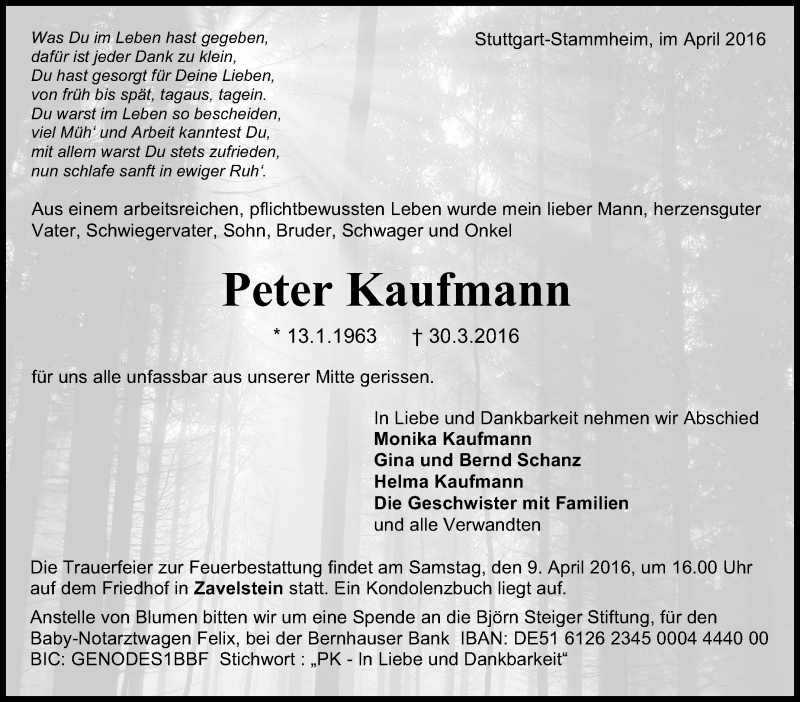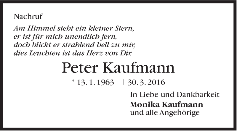 Hier finden Sie alle Traueranzeigen aus der Zeitung, die bisher für Peter Kaufmann erschienen sind. Weitere Traueranzeigen, die in der Zeitung erscheinen, werden hier ebenfalls aufgelistet