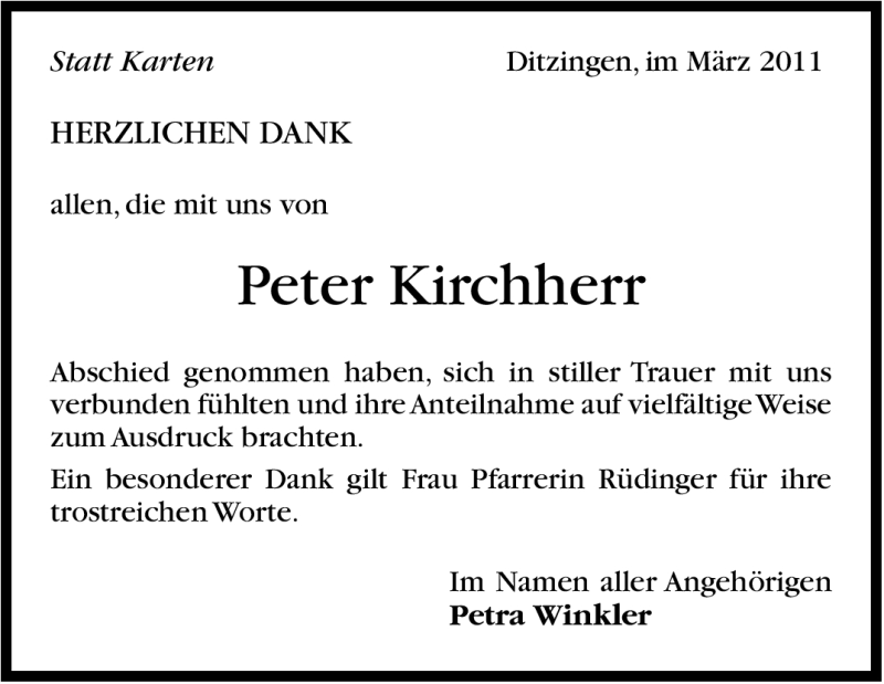 Hier finden Sie alle Traueranzeigen aus der Zeitung, die bisher für Peter Kirchherr erschienen sind. Weitere Traueranzeigen, die in der Zeitung erscheinen, werden hier ebenfalls aufgelistet