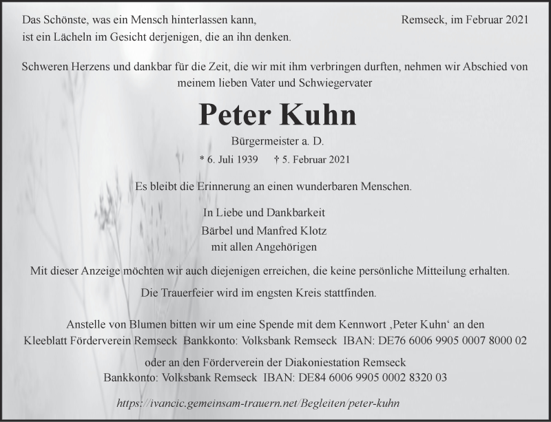 Hier finden Sie alle Traueranzeigen aus der Zeitung, die bisher für Peter Kuhn erschienen sind. Weitere Traueranzeigen, die in der Zeitung erscheinen, werden hier ebenfalls aufgelistet