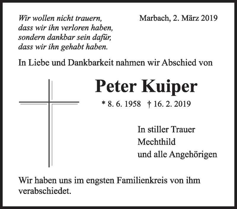 Hier finden Sie alle Traueranzeigen aus der Zeitung, die bisher für Peter Kuiper erschienen sind. Weitere Traueranzeigen, die in der Zeitung erscheinen, werden hier ebenfalls aufgelistet