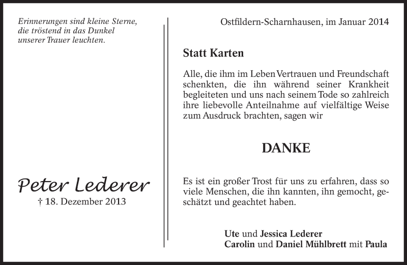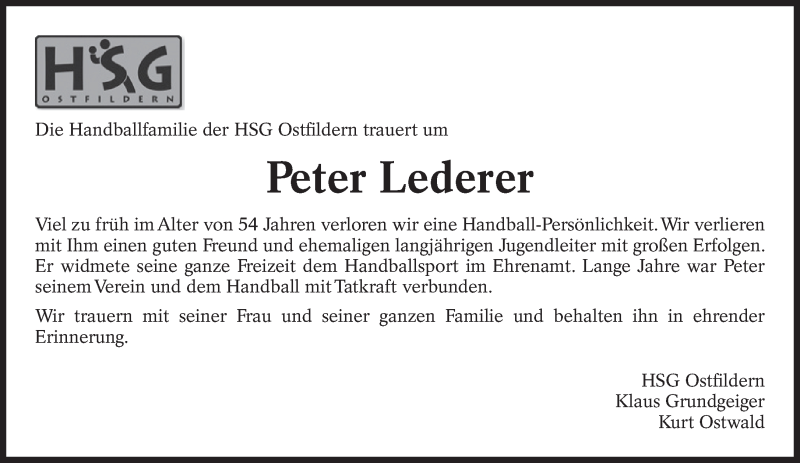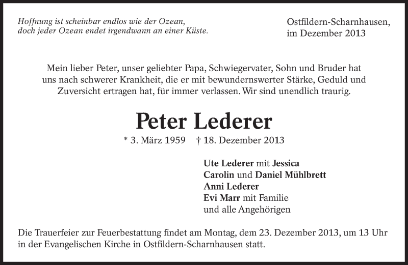 Hier finden Sie alle Traueranzeigen aus der Zeitung, die bisher für Peter Lederer erschienen sind. Weitere Traueranzeigen, die in der Zeitung erscheinen, werden hier ebenfalls aufgelistet