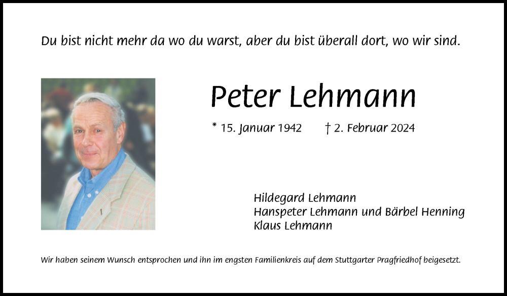 Hier finden Sie alle Traueranzeigen aus der Zeitung, die bisher für Peter Lehmann erschienen sind. Weitere Traueranzeigen, die in der Zeitung erscheinen, werden hier ebenfalls aufgelistet