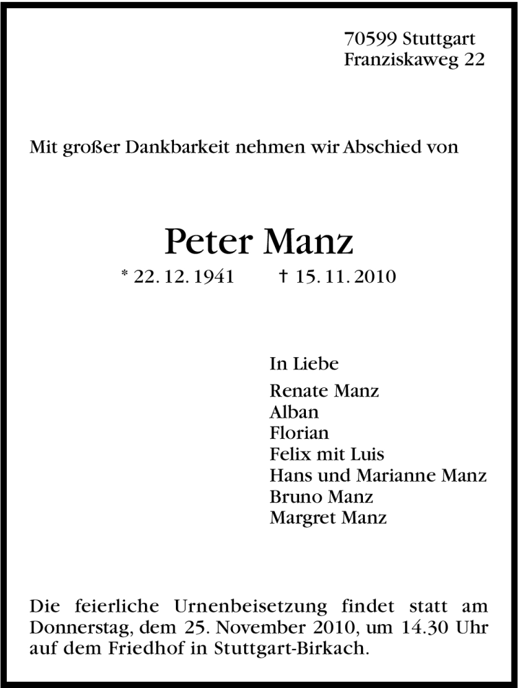 Hier finden Sie alle Traueranzeigen aus der Zeitung, die bisher für Peter Manz erschienen sind. Weitere Traueranzeigen, die in der Zeitung erscheinen, werden hier ebenfalls aufgelistet