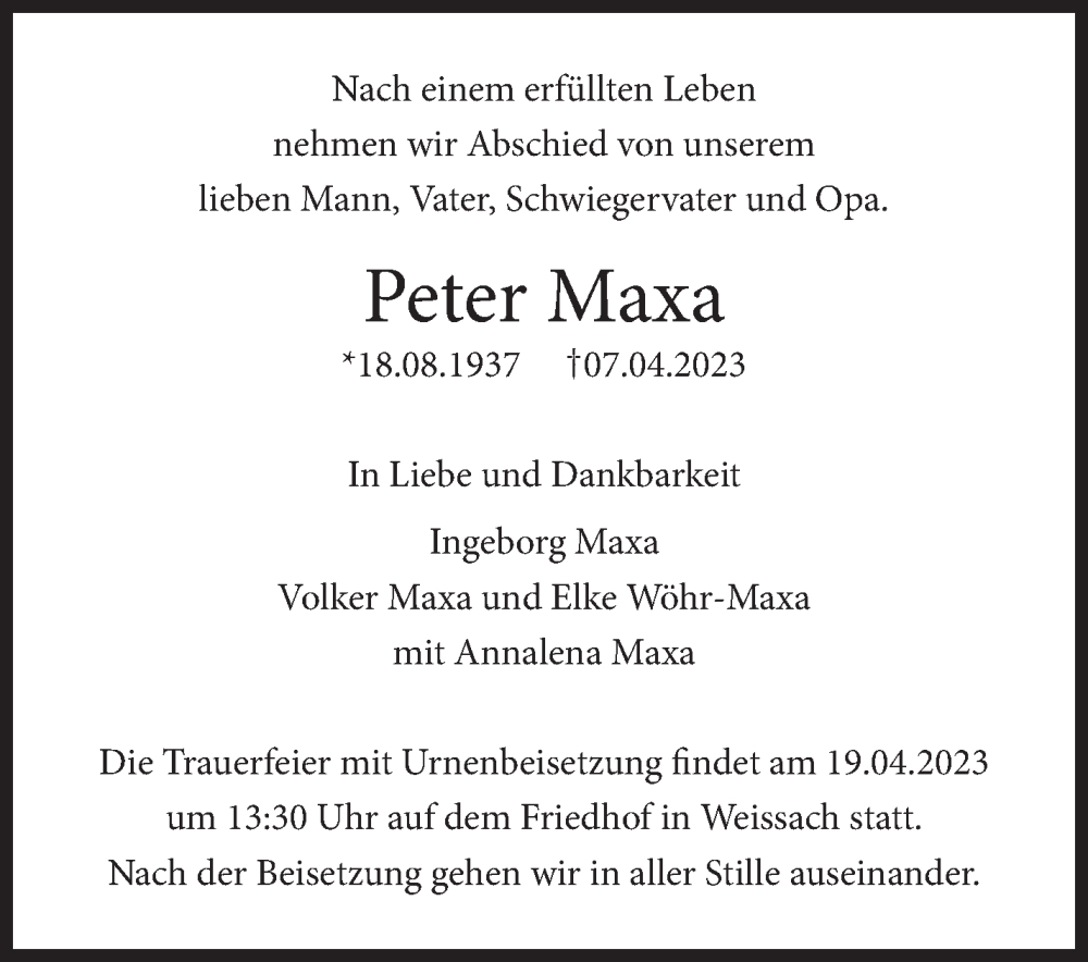 Hier finden Sie alle Traueranzeigen aus der Zeitung, die bisher für Peter Maxa erschienen sind. Weitere Traueranzeigen, die in der Zeitung erscheinen, werden hier ebenfalls aufgelistet