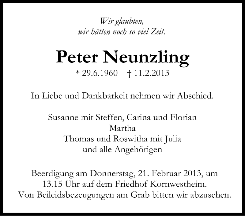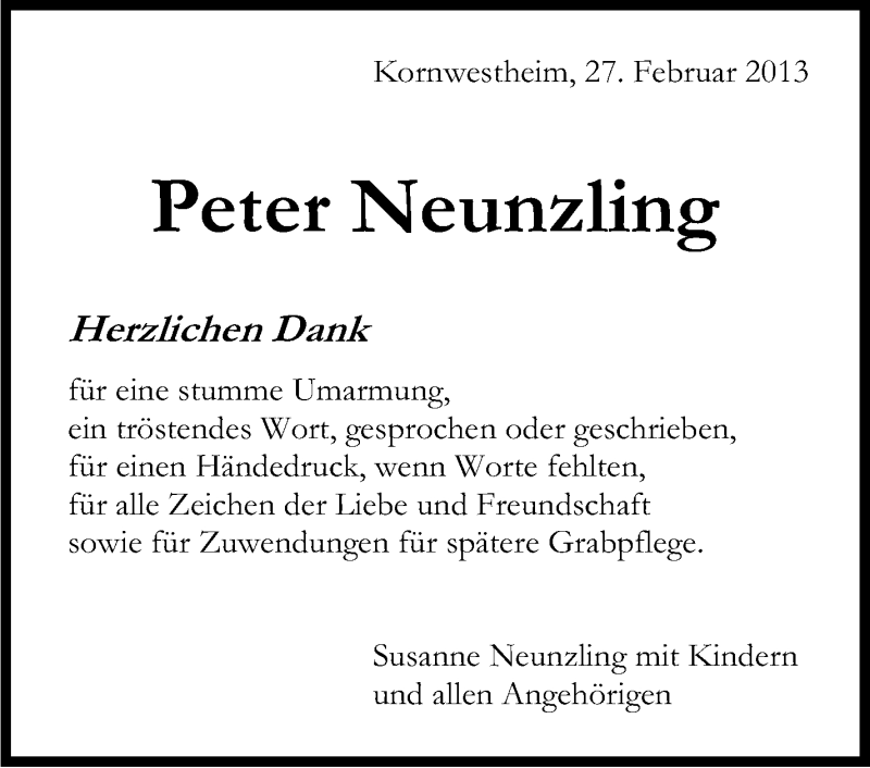 Hier finden Sie alle Traueranzeigen aus der Zeitung, die bisher für Peter Neunzling erschienen sind. Weitere Traueranzeigen, die in der Zeitung erscheinen, werden hier ebenfalls aufgelistet