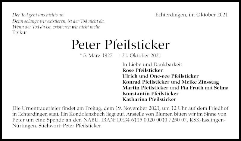 Hier finden Sie alle Traueranzeigen aus der Zeitung, die bisher für Peter Pfeilsticker erschienen sind. Weitere Traueranzeigen, die in der Zeitung erscheinen, werden hier ebenfalls aufgelistet