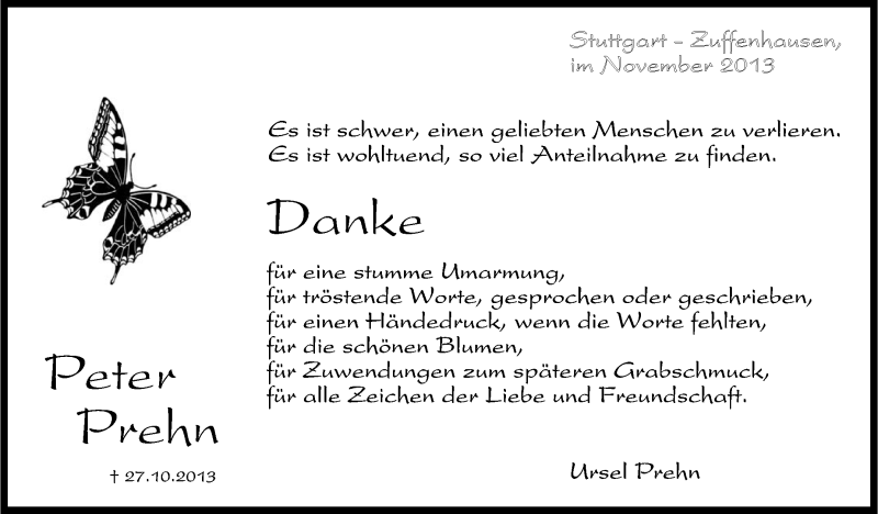 Hier finden Sie alle Traueranzeigen aus der Zeitung, die bisher für Peter Prehn erschienen sind. Weitere Traueranzeigen, die in der Zeitung erscheinen, werden hier ebenfalls aufgelistet
