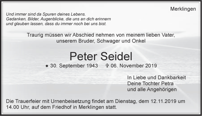 Hier finden Sie alle Traueranzeigen aus der Zeitung, die bisher für Peter Seidel erschienen sind. Weitere Traueranzeigen, die in der Zeitung erscheinen, werden hier ebenfalls aufgelistet