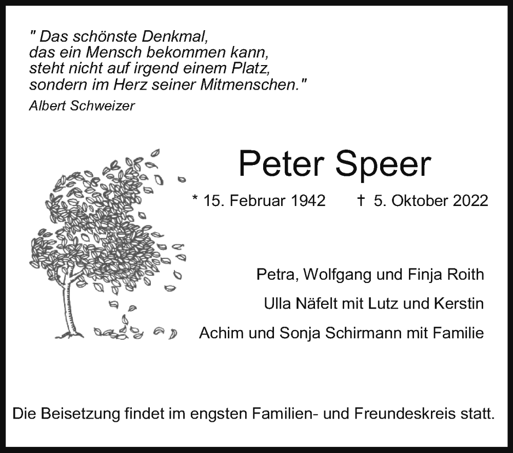 Hier finden Sie alle Traueranzeigen aus der Zeitung, die bisher für Peter Speer erschienen sind. Weitere Traueranzeigen, die in der Zeitung erscheinen, werden hier ebenfalls aufgelistet