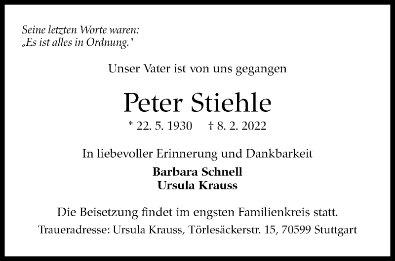 Hier finden Sie alle Traueranzeigen aus der Zeitung, die bisher für Peter Stiehle erschienen sind. Weitere Traueranzeigen, die in der Zeitung erscheinen, werden hier ebenfalls aufgelistet