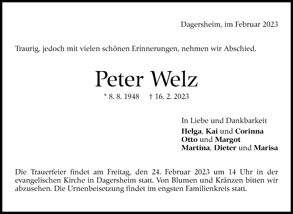 Hier finden Sie alle Traueranzeigen aus der Zeitung, die bisher für Peter Welz erschienen sind. Weitere Traueranzeigen, die in der Zeitung erscheinen, werden hier ebenfalls aufgelistet