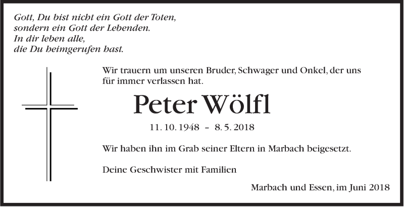 Hier finden Sie alle Traueranzeigen aus der Zeitung, die bisher für Peter Wölfl erschienen sind. Weitere Traueranzeigen, die in der Zeitung erscheinen, werden hier ebenfalls aufgelistet
