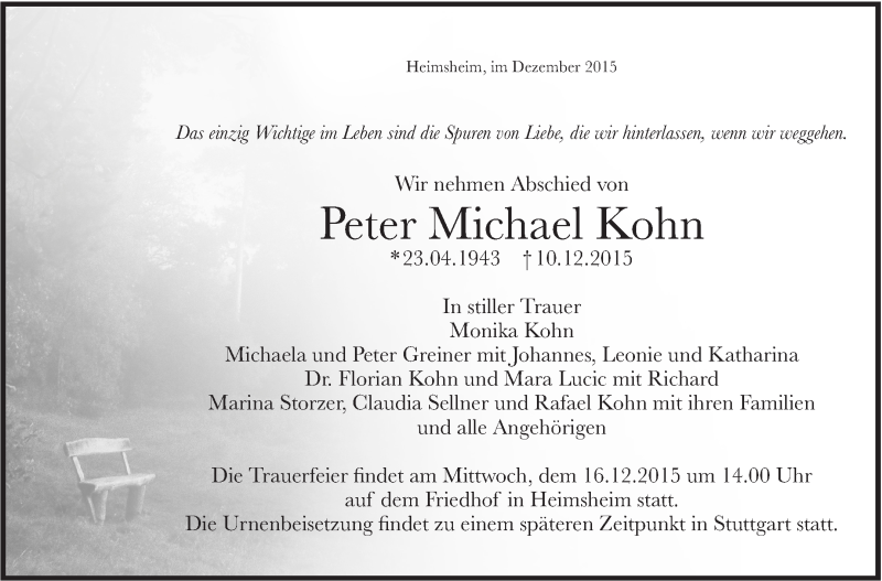 Hier finden Sie alle Traueranzeigen aus der Zeitung, die bisher für Peter Michael Kohn erschienen sind. Weitere Traueranzeigen, die in der Zeitung erscheinen, werden hier ebenfalls aufgelistet