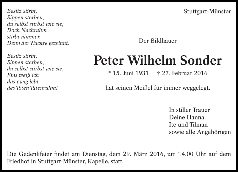 Hier finden Sie alle Traueranzeigen aus der Zeitung, die bisher für Peter Wilhelm Sonder erschienen sind. Weitere Traueranzeigen, die in der Zeitung erscheinen, werden hier ebenfalls aufgelistet