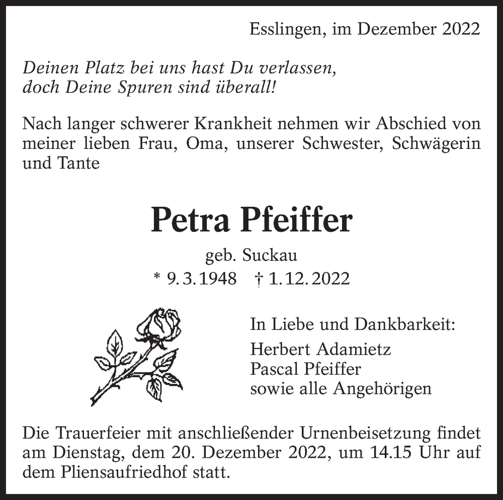 Hier finden Sie alle Traueranzeigen aus der Zeitung, die bisher für Petra Pfeiffer erschienen sind. Weitere Traueranzeigen, die in der Zeitung erscheinen, werden hier ebenfalls aufgelistet