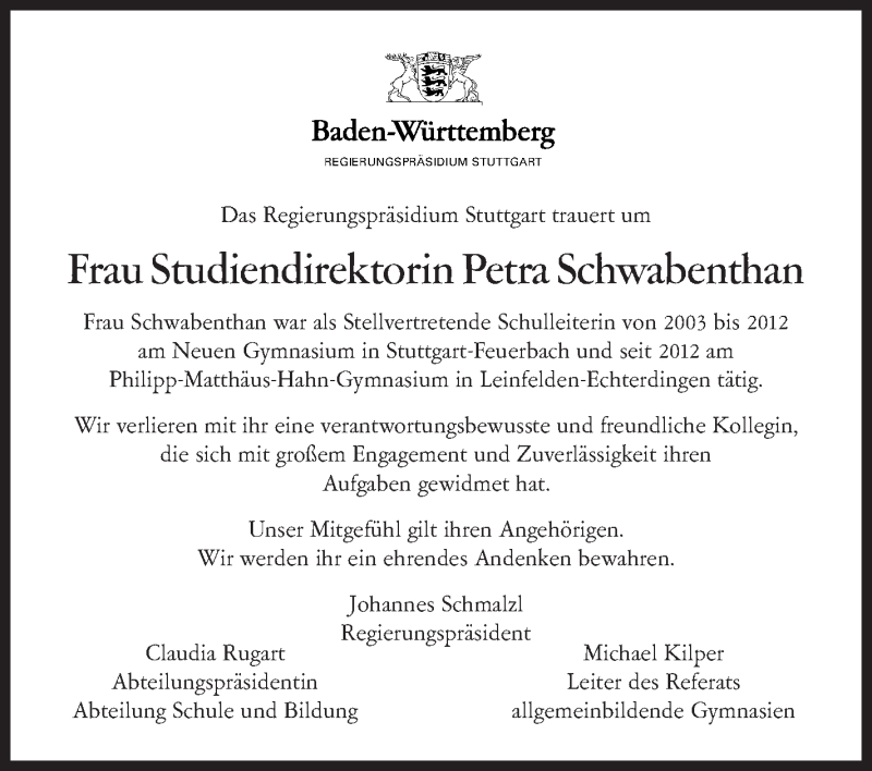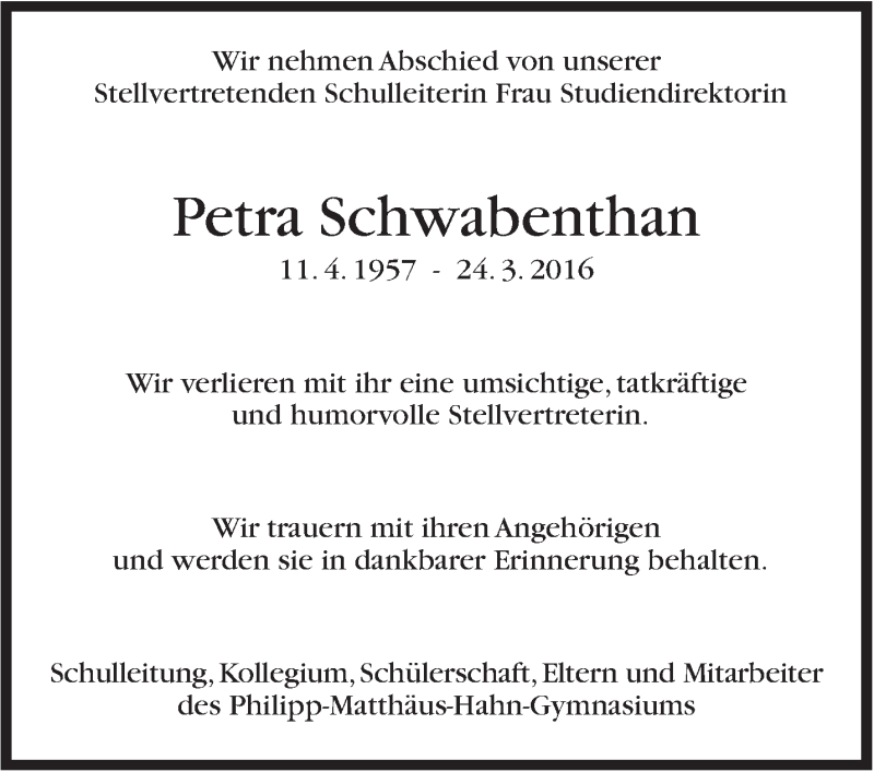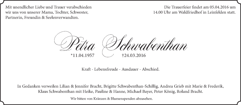 Hier finden Sie alle Traueranzeigen aus der Zeitung, die bisher für Petra Schwabenthan erschienen sind. Weitere Traueranzeigen, die in der Zeitung erscheinen, werden hier ebenfalls aufgelistet