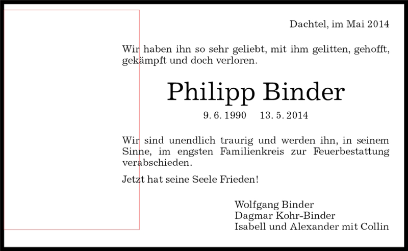 Hier finden Sie alle Traueranzeigen aus der Zeitung, die bisher für Philipp Binder erschienen sind. Weitere Traueranzeigen, die in der Zeitung erscheinen, werden hier ebenfalls aufgelistet