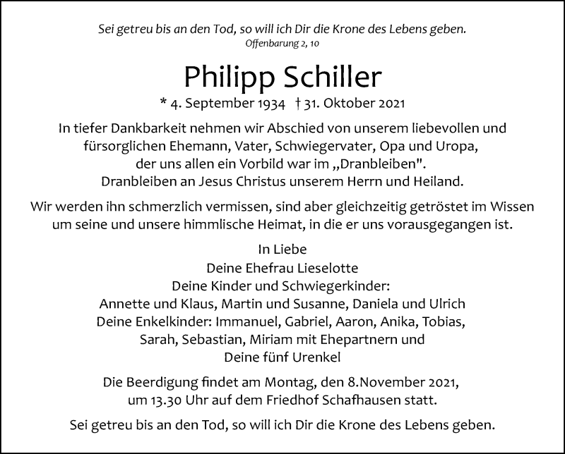 Hier finden Sie alle Traueranzeigen aus der Zeitung, die bisher für Philipp Schiller erschienen sind. Weitere Traueranzeigen, die in der Zeitung erscheinen, werden hier ebenfalls aufgelistet