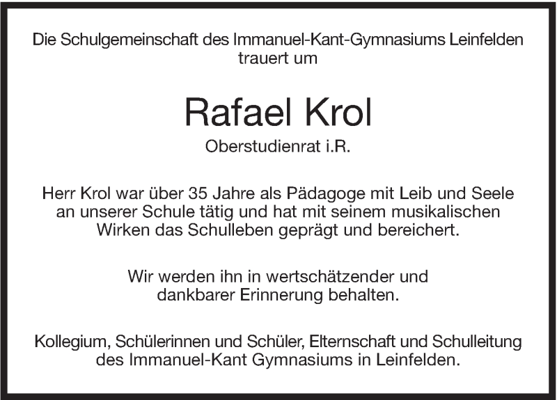 Hier finden Sie alle Traueranzeigen aus der Zeitung, die bisher für Rafael Krol erschienen sind. Weitere Traueranzeigen, die in der Zeitung erscheinen, werden hier ebenfalls aufgelistet