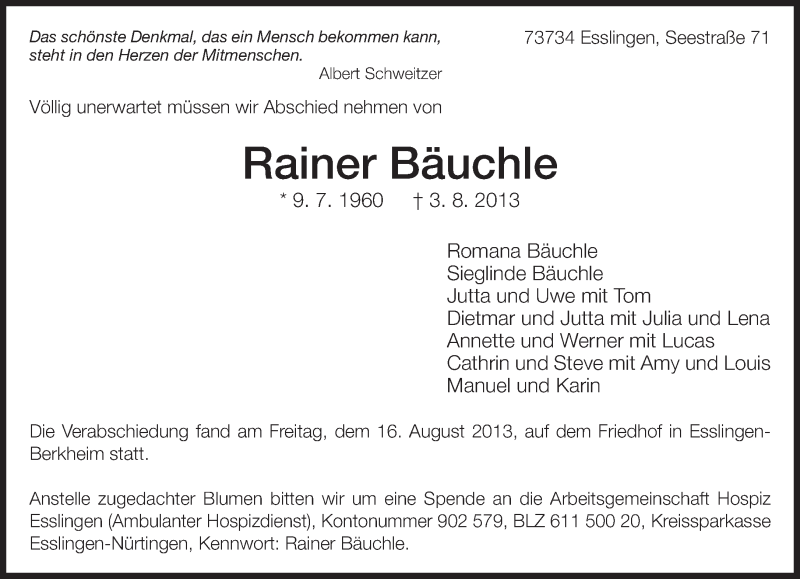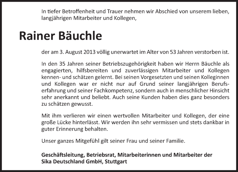 Hier finden Sie alle Traueranzeigen aus der Zeitung, die bisher für Rainer Bäuchle erschienen sind. Weitere Traueranzeigen, die in der Zeitung erscheinen, werden hier ebenfalls aufgelistet