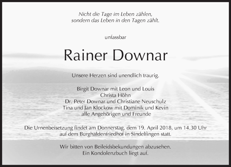 Hier finden Sie alle Traueranzeigen aus der Zeitung, die bisher für Rainer Downar erschienen sind. Weitere Traueranzeigen, die in der Zeitung erscheinen, werden hier ebenfalls aufgelistet