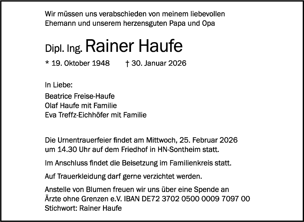 Hier finden Sie alle Traueranzeigen aus der Zeitung, die bisher für Rainer Haufe erschienen sind. Weitere Traueranzeigen, die in der Zeitung erscheinen, werden hier ebenfalls aufgelistet