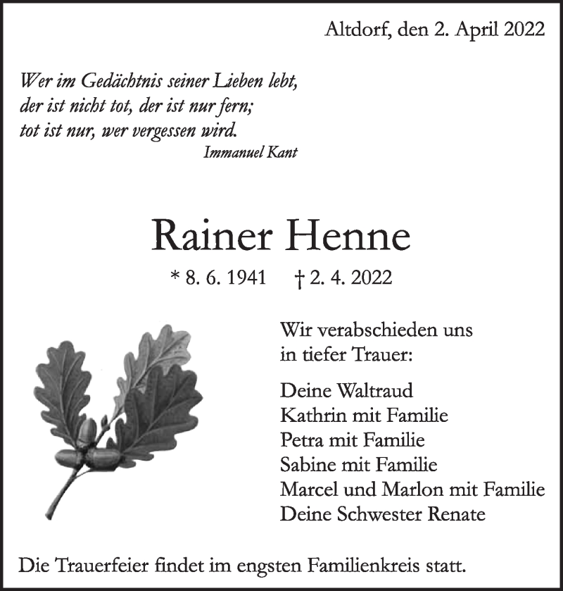 Hier finden Sie alle Traueranzeigen aus der Zeitung, die bisher für Rainer Henne erschienen sind. Weitere Traueranzeigen, die in der Zeitung erscheinen, werden hier ebenfalls aufgelistet
