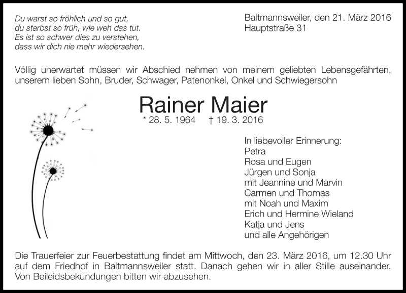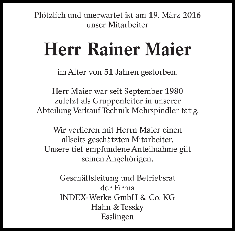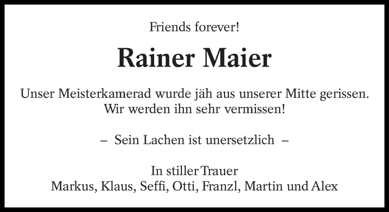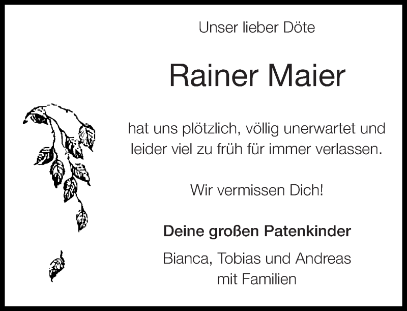 Hier finden Sie alle Traueranzeigen aus der Zeitung, die bisher für Rainer Maier erschienen sind. Weitere Traueranzeigen, die in der Zeitung erscheinen, werden hier ebenfalls aufgelistet