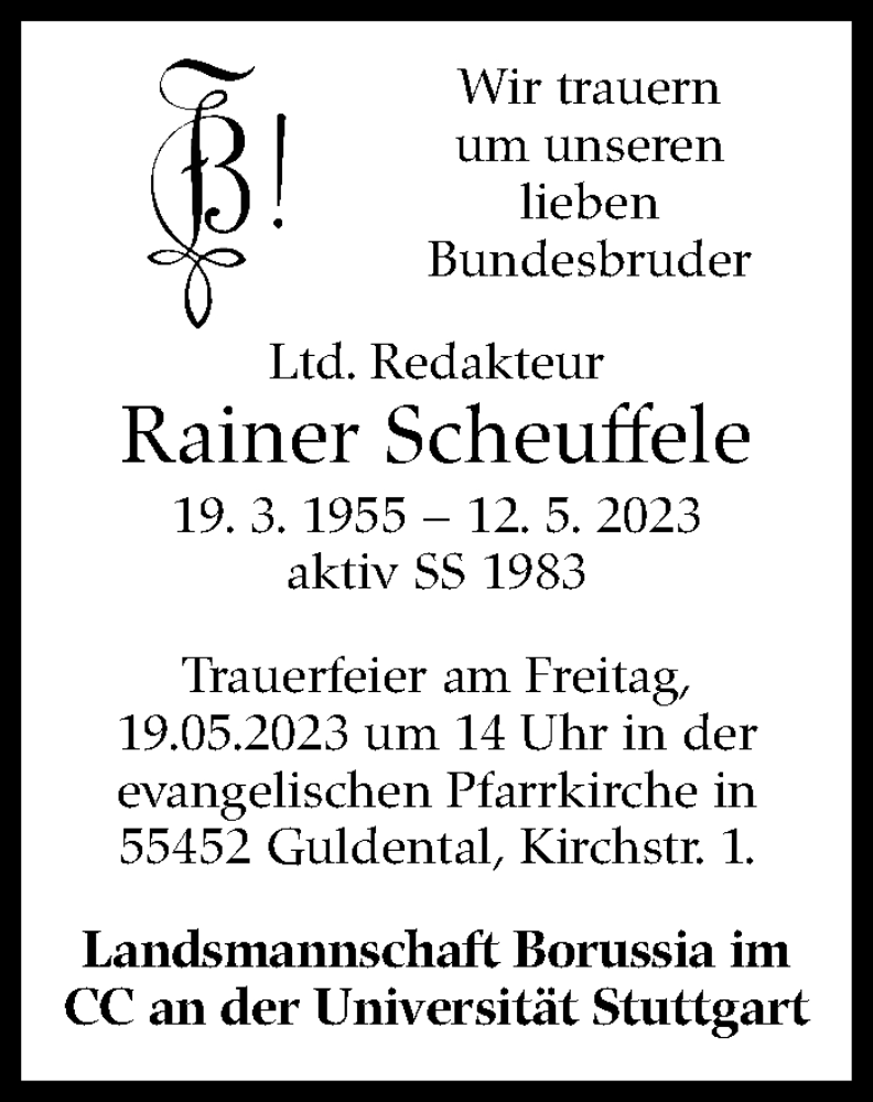 Hier finden Sie alle Traueranzeigen aus der Zeitung, die bisher für Rainer Scheuffele erschienen sind. Weitere Traueranzeigen, die in der Zeitung erscheinen, werden hier ebenfalls aufgelistet