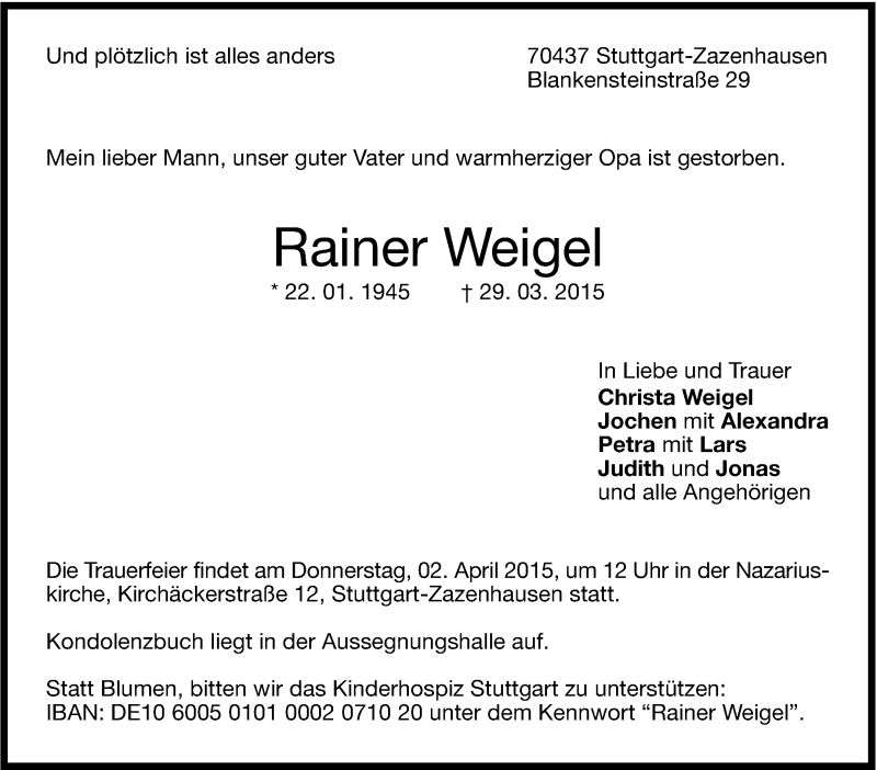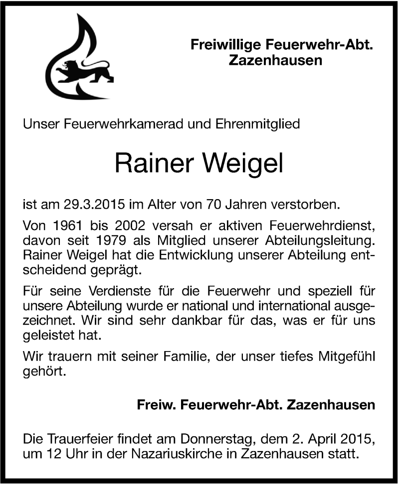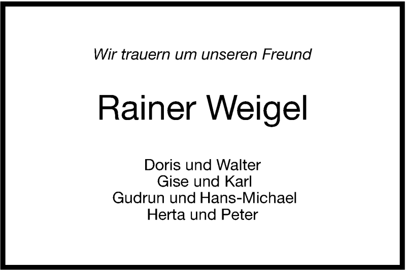 Hier finden Sie alle Traueranzeigen aus der Zeitung, die bisher für Rainer Weigel erschienen sind. Weitere Traueranzeigen, die in der Zeitung erscheinen, werden hier ebenfalls aufgelistet