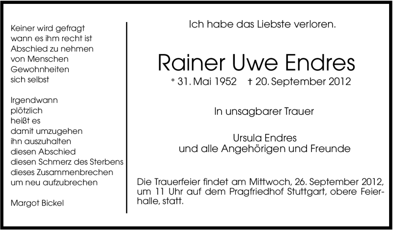 Hier finden Sie alle Traueranzeigen aus der Zeitung, die bisher für Rainer Uwe Endres erschienen sind. Weitere Traueranzeigen, die in der Zeitung erscheinen, werden hier ebenfalls aufgelistet