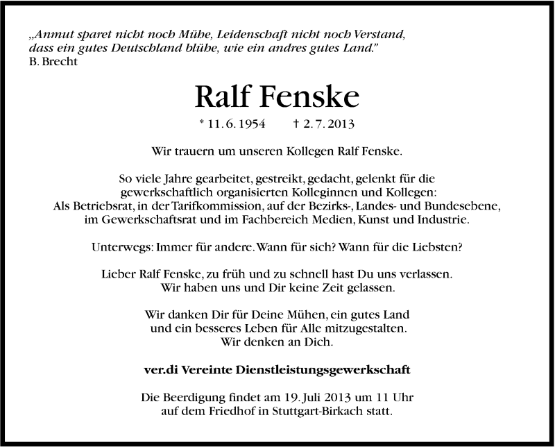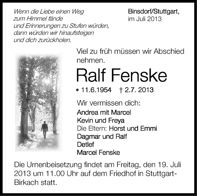Hier finden Sie alle Traueranzeigen aus der Zeitung, die bisher für Ralf Fenske erschienen sind. Weitere Traueranzeigen, die in der Zeitung erscheinen, werden hier ebenfalls aufgelistet