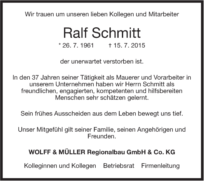 Hier finden Sie alle Traueranzeigen aus der Zeitung, die bisher für Ralf Schmitt erschienen sind. Weitere Traueranzeigen, die in der Zeitung erscheinen, werden hier ebenfalls aufgelistet