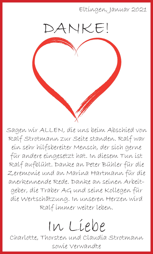 Hier finden Sie alle Traueranzeigen aus der Zeitung, die bisher für Ralf Strotmann erschienen sind. Weitere Traueranzeigen, die in der Zeitung erscheinen, werden hier ebenfalls aufgelistet