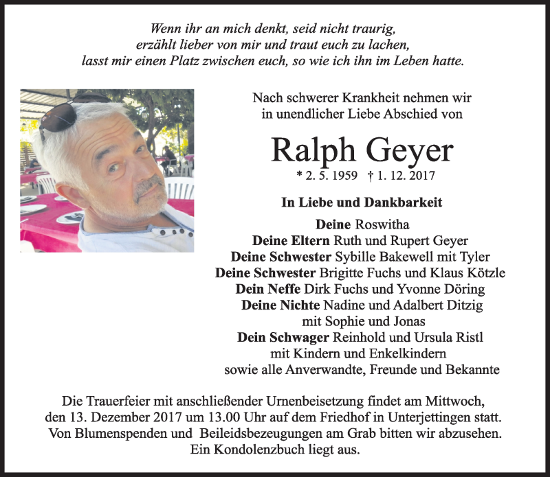 Hier finden Sie alle Traueranzeigen aus der Zeitung, die bisher für Ralph Geyer erschienen sind. Weitere Traueranzeigen, die in der Zeitung erscheinen, werden hier ebenfalls aufgelistet