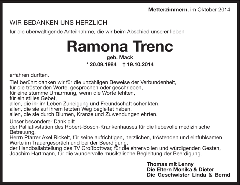 Hier finden Sie alle Traueranzeigen aus der Zeitung, die bisher für Ramona Trenc erschienen sind. Weitere Traueranzeigen, die in der Zeitung erscheinen, werden hier ebenfalls aufgelistet